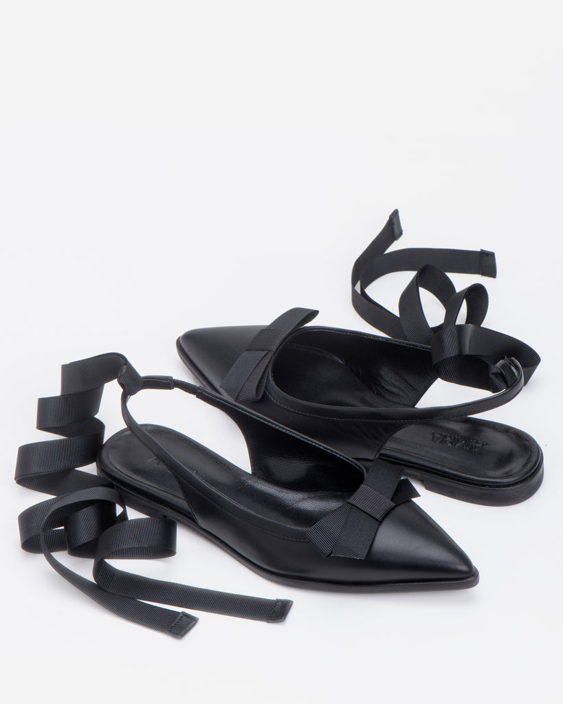 This ballet flat is a comfortable favorite for an effortlessly elegant look. Slingback style, pointed toes combined with bowtie, made from soft leather, will be timeless addition to your wardrobe. The lace can be removed.